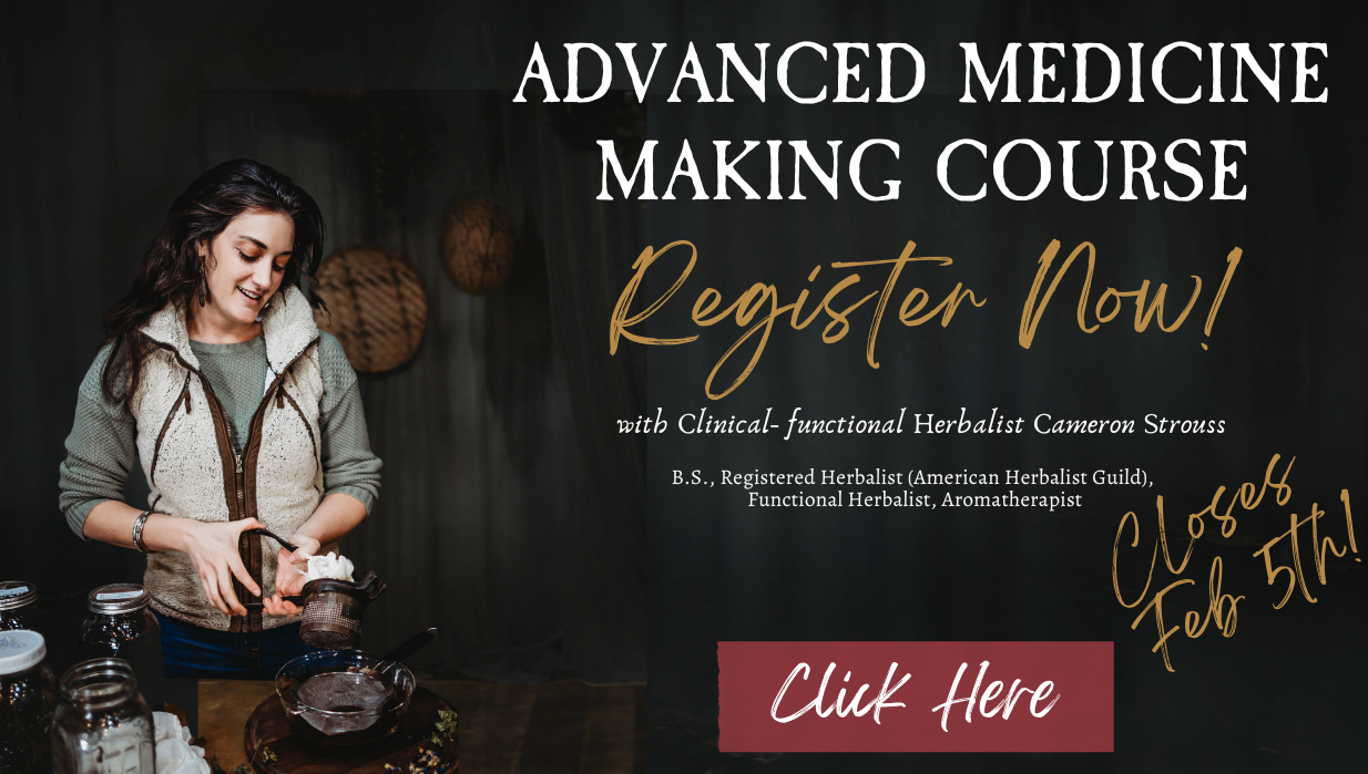 My name is Cameron Strouss and I am a Clinical/Functional Herbalist, Registered Herbalist with the American Herbalist Guild, Certified Aromatherapist, Master Gardener, medicine maker extraordinaire, forager of 14 years and clinician of 9 years. (If you want my extended nerdy credentials click here.)